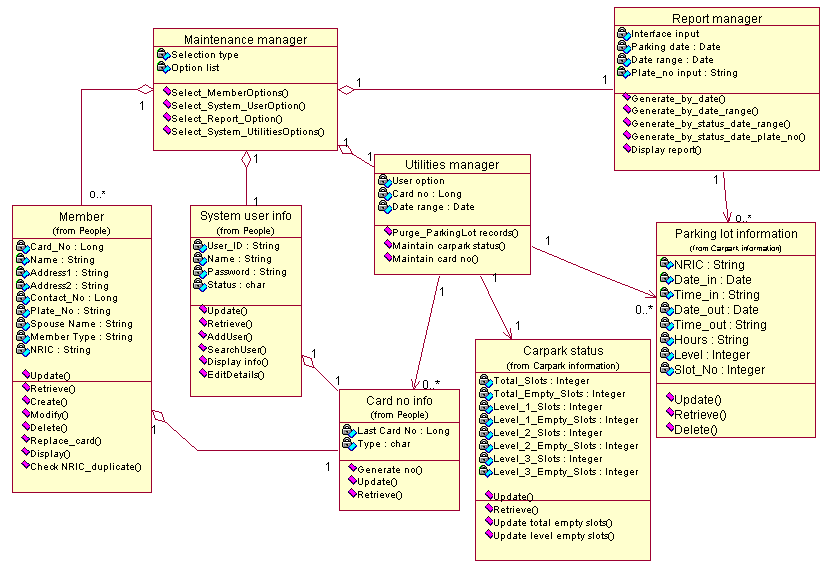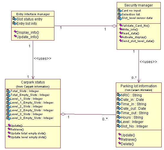The security manager and entry interface manager classes has been created so that they actually deals with the carpark status information and the parking lot information. The security class managed the entry of every vehicle entering and it pass messages to the parking lots information class to store every successful entry. The entry interface class provides the information to member by sending messages to the carpark class to retrieve the relevant data.