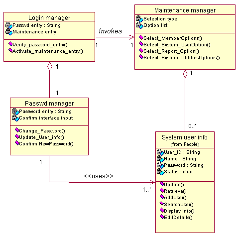 The login manager determine the status of the system user who has enter into the system by verifying the password entered. The password class, which is under the security class is to also perform the changing of the password for the system user. Upon successful login, message can be send to the maintenance class that it will be activating it to access the system's maintenance facilities.